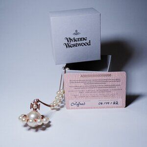 Vivienne Westwood long orb pearl necklace in rose gold tone metal with pink enamel cross detail. Includes original box, dustbag and card.