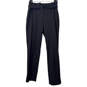 pants have a high-rise waist with a wide waistband and a button closure at the front. There are visible pleats at the top of the legs, giving them a tailored look. The pants have a single front pleat down each leg, hidden side seam pockets, and back welt pockets.