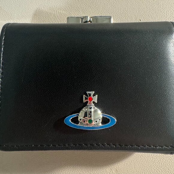 Vivienne Westwood leather wallet. Bought at hongkong international airport. Used about twice. Has a small scratch but not very prominent. Comes with original box.
