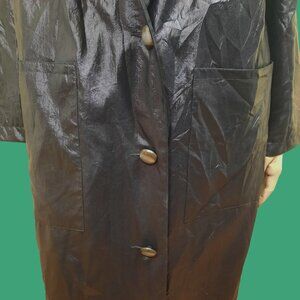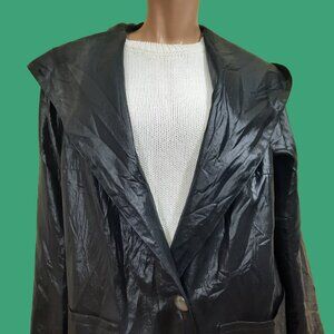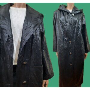 Vntage 90s Shiny Black Duster Jacket Long Full Length Coat Crinkled Hooded Sz L
