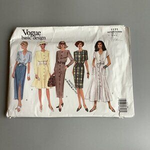 This is a vintage Vogue Basic Design sewing pattern #1171, featuring versatile dress styles for women. The pattern includes designs for button-down dresses with options for below-knee or above-ankle lengths, different sleeve lengths, and fitted or belted waists. Pattern is graded as EASY, suitable for beginners or those seeking a quick project.