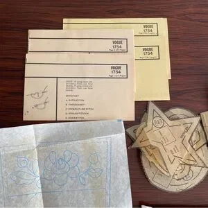 Vogue pattern for embroidered stocking and ornaments. All pattern pieces and instructions included, but ONLY stocking pattern embroidery transfer. Transfers for smaller ornaments are NOT included. I can include one yard of white felt with it.