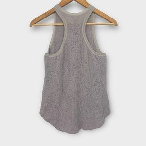 Chic and airy Aritzia Wilfred Volant tank in a soft dove grey colour with a pastel purple undertone. Features delicate paisley lace overlay with full lining, curved hem, and sporty racerback cut. Feminine and elevated—perfect with denim, trousers, or tucked into skirts.