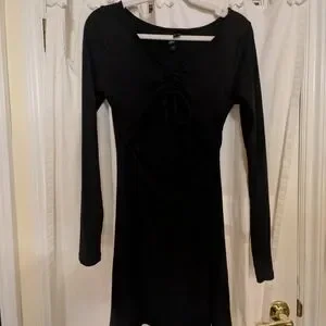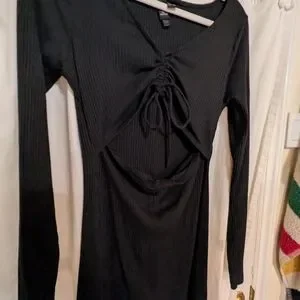 Chic black mini dress with ruched front. Long sleeves and V-neckline. Perfect for stylish outings.