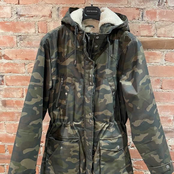 Like new Volcom parka. Camo colour with Sherpa on the inside. Fishtail in the back. Adjustable drawstring waist.