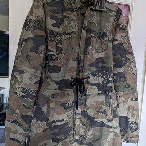 Winter jacket in Camouflage print. Features drawstring waist, roomy front pockets, two decorative breast pockets, removable faux fur trimmed hood and sweet pointed back hemline. Zipper has snap over placket.