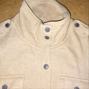 It's cream color, has a funnel/high neck style, button up, with 4 front pockets. It's soft and has some stretch to it, it's made of 80% Cotton and 20% Polyester.