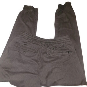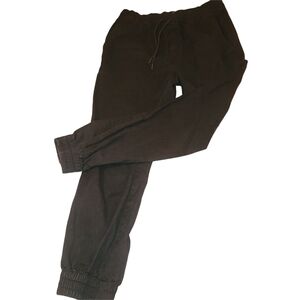 Comfortable and stylish dark gray jogger pants perfect for casual wear. Features an elastic waistband with drawstring for a secure fit and elastic cuffs. Has 2 side pockets and 2 back pockets.