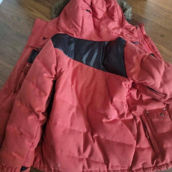 Volcom, High Performance Snowboard Jacket, Red with Leather Trim & Hood, Size M