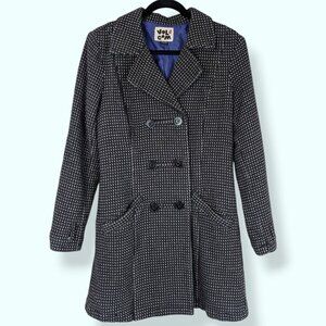 This pea coat by Volcom has a black and white houndstooth exterior of 100% cotton and a vibrant lined blue interior of 100% polyester. The coat has a double button front with a hidden top button inside, 2 front pockets, and belt loops on the sleeve cuffs (but no sleeve belts). There is also a slit at the very back bottom that has two buttons, both of which are present. The coat has a good fit and normal wear.