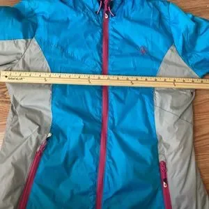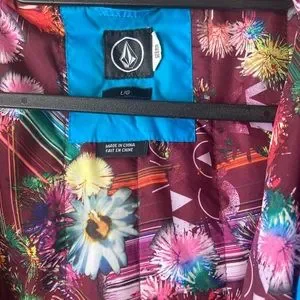 EUC Women’s Large Blue and Gray with Pink accents Floral design on interior of jacket