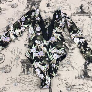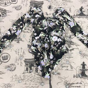 Volcom's bodysuit-inspired swimsuit features a fierce lace-up neckline and breezy open back with long sleeves.