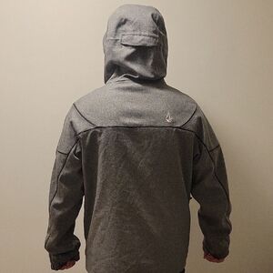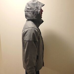 Stylish gray jacket with hood. Features zippered pockets. Ideal for outdoor activities.