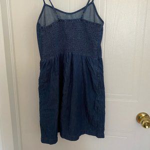 Medium-weight blue denim is sewn into a darted triangle bodice with adjustable spaghetti straps and a stretchy smocked back panel.