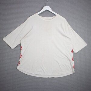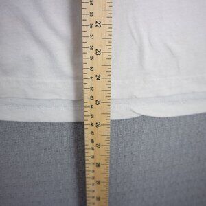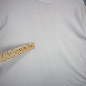 Wide and cropped oversized fitting tee with graphic design, has overall yellowing staining on the front as pictured