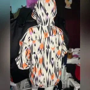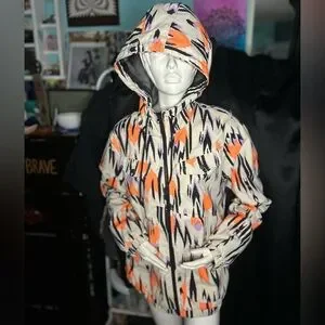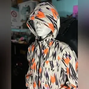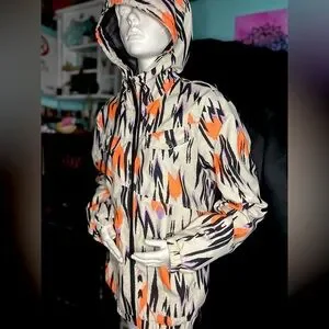 Stylish Volcom ski jacket. Features bold orange and black pattern on cream background. Perfect for winter sports. Good condition