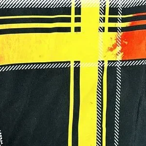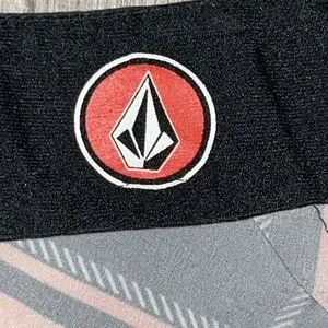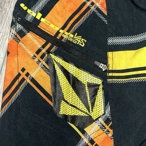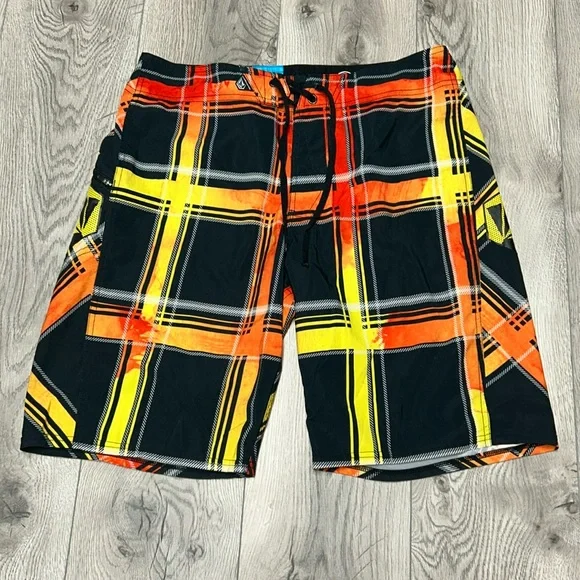 Volcom Pure Function Board Shorts in black with a red and orange plaid pattern. Logos on the back and waistband. Light staining noted in the pictures but otherwise in great pre-owned condition. Measurements in the pictures.