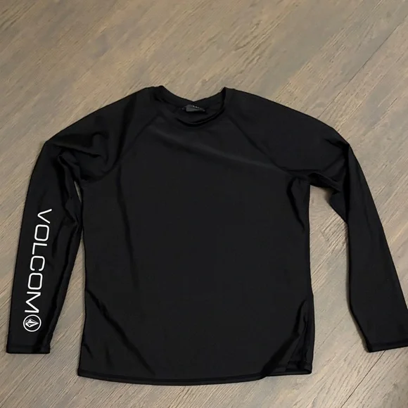 Sleek black rash guard with bold white Volcom logo on sleeve. Ideal for water sports. Worn once; like new Swimsuit material fast drying