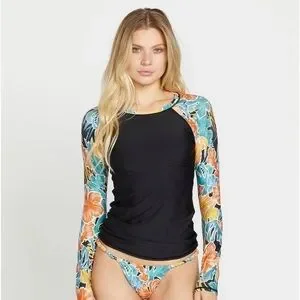 Sunny days and fun waves? Stay protected with the Take It Easy Long Sleeve Rashguard. This women's pullover surf shirt is made with Repreve® recycled polyester and elastane for superior stretch, durability, and enhanced sun protection. Designed with a solid core and printed sleeves for signature Volcom style.