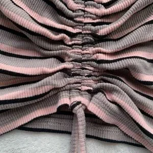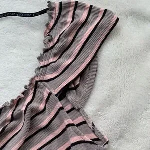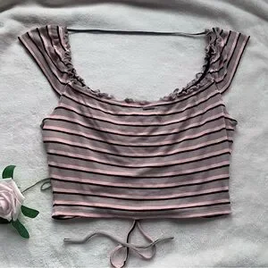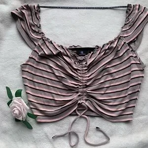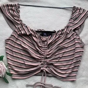 This stretchy ribbed knit drawstring crop top from Volcom is in excellent, like-new condition. No holes or stains or signs of wear. Size small (please see measurements below for fit). Front can be cinched tighter to style. Slightly off-the-shoulder sleeves with ribbon attached to hold in place, very flattering and sexy.