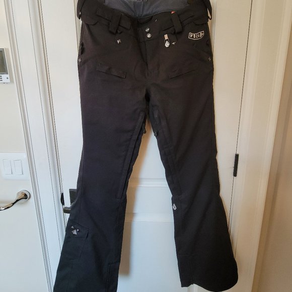 Volcom snowboard jacket AND pants, size small, both like new condition *except for small wear on black leather detail around one jacket pocket - see photo*. Worn only a few times. Jacket is a bit more burgundy than the photos (not quite as red/bright). Several pockets inside and out, powder skirt, grey sherpa around neck and inside (not sleeves).