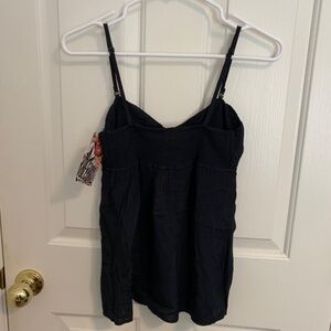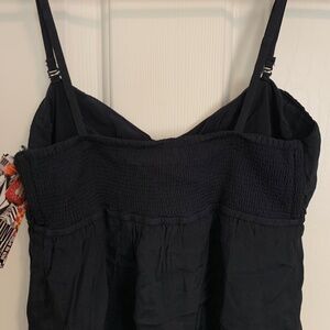 Stylish black , satin sheen fabric with smocked back gives stretch, with adjustable straps.