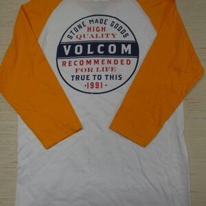Classic Volcom “Stone Made Goods” long sleeve raglan t-shirt with contrast gold sleeves and white body. Features a small chest logo print on the front and a large circular “Recommended for Life – True to This – 1991” graphic on the back.