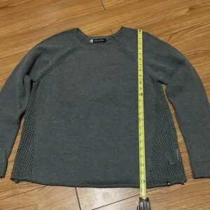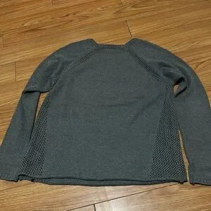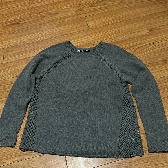 Grey Volcom Sweater. Size large. Has open knit down each side and a diagonally down front and back. 55% cotton 45% acrylic.