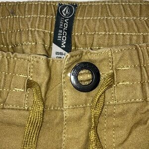 Good used condition no noticeable stains. These appeared to be pants that have been cut off to be Bermuda shorts. Good quality COTTON BLEND CANVAS. AI description: These Volcom tan shorts feature a classic flat front style, offering a clean and versatile look. The neutral tan color makes them a perfect match for various outfits, ensuring they are a staple in any wardrobe. Ideal for casual occasions, these shorts provide both comfort and style.