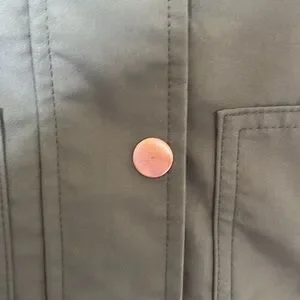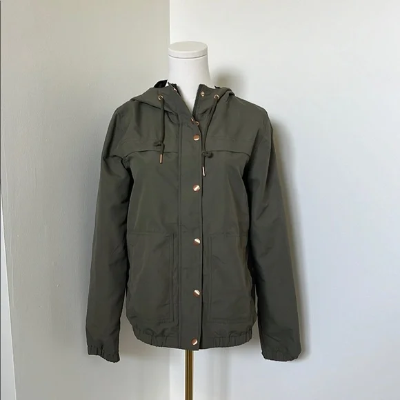 This Women’s Volcom Green Utility Jacket is a perfect blend of style and functionality. Rose gold/coppery coloured button flap that covers zipper front. Size XS, fairly true to size, maybe slightly bigger. In like-new condition overall, with very slight scratches on two of the buttons (pictured). From a pet/smoke free home.
