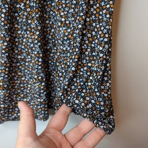 Add a touch of boho charm to your wardrobe with this Volcom women's floral peasant blouse. Featuring a black base with an allover tiny floral print in shades of blue and mustard, this size Small (4/6) top embraces a relaxed, cottagecore aesthetic. The flowy fit and gathered waist offer comfort and style, while the scoop neckline and long sleeves add a feminine flair. Perfect for casual wear, layering, or pairing with your favorite jeans or skirt.