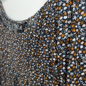 Add a touch of boho charm to your wardrobe with this Volcom women's floral peasant blouse. Featuring a black base with an allover tiny floral print in shades of blue and mustard, this size Small (4/6) top embraces a relaxed, cottagecore aesthetic. The flowy fit and gathered waist offer comfort and style, while the scoop neckline and long sleeves add a feminine flair. Perfect for casual wear, layering, or pairing with your favorite jeans or skirt.