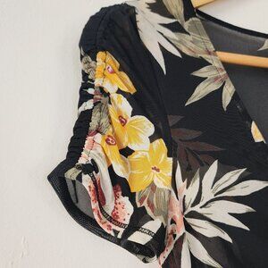 Volcom XS Tropical Floral Black Mesh Ruched Vneck Top Summer Costal Cowgirl Boho