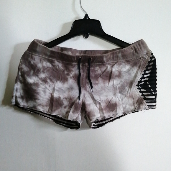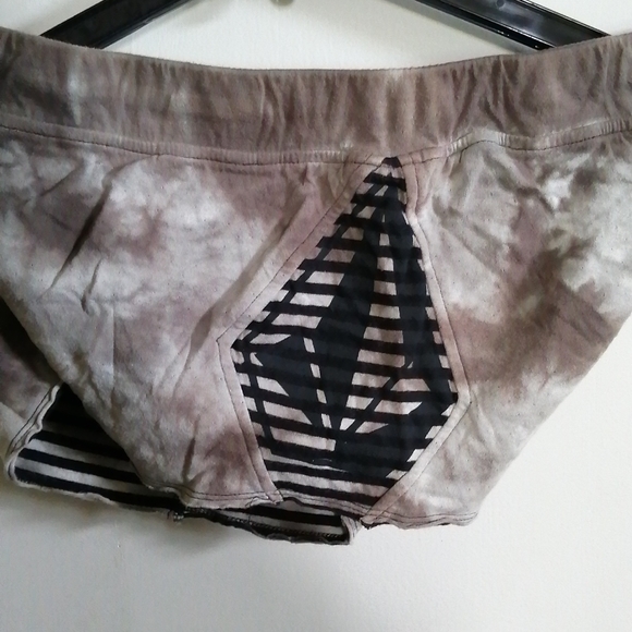 Tye dye volcom lounge shorts striped inside Tie waist. couple spots in gusset shown. size large approximately 16" across waist and 2" inseam