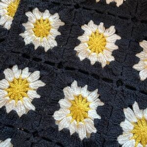 In excellent condition. Crochet look sweater in black with sun flowers. One size fits most. When laying flat Pit to pit 27”, length 18”. 100% cotton.