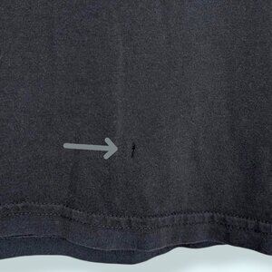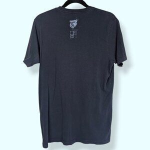 This t-shirt by Volcom (and Shawn Higgins) is made of 100% organic cotton and is a dark blue with short sleeves and a crew neckline. The front of the shirt features one of my favourite graphics of any shirt I've ever bought: a colourful werewolf man wearing glasses and shooting blue laser beams out of his eyes. There is a small blue logo on the back of the neck acknowledging the artist, and a small Volcom tag on the front bottom left. The shirt has normal wear, including a small hole on the front towards the bottom (see pic 4) and some small cracks in the graphic, but it is still very wearable and still very, very cool.