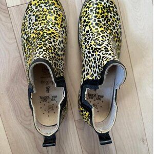 Bold yellow and black leopard print short rain boots by Volks Walkers. Made in Spain with ergonomic Air-Bag sole technology for maximum comfort. Easy slip-on Chelsea style with side stretch panels and pull tabs. Perfect mix of functional and standout style for wet weather.