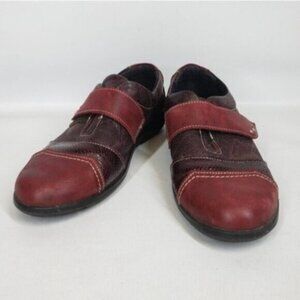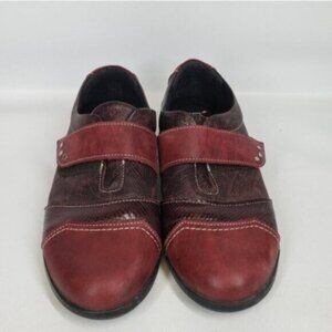 Red merlot slip on leather shoe with hook and loop strap for extra support. Made in Portugal