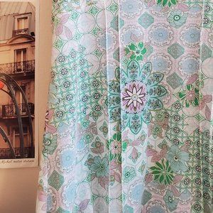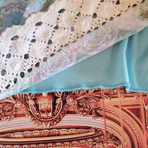 Almost vintage mid-00's dress. 70s meets 90s with boho print and spaghetti-straps. Sweet crochet lace details on top and bottom hem. Fabric has stretch. Lining is a separate dress, not attached. Adjustable straps on outer dress only. Good used condition. Bought in 2006. Very slight pilling but still looks great!