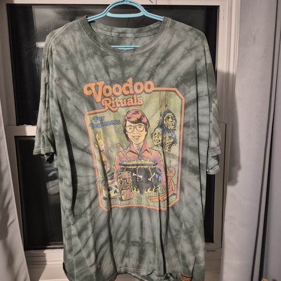 Green tie-dye t-shirt with a 'Voodoo Rituals' graphic. Features a unique design with vibrant colors.