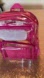 Stylish clear pink backpack with multiple compartments. Perfect for school or travel.