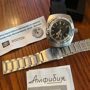 Features:Rotating bezel, date window, screw down crown, stainless steel and extra rubber strap