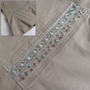 A gorgeous blazer in a khaki beige colour with intricate embroidered patterns and beads in a silver hue. It’s made from a cotton blend with a comfortable stretch and comes unlined for a lightweight feel. Note*: There are areas with discoloration, on collar and as shown in last photo. Overall, it’s still in very good condition.