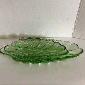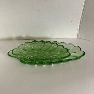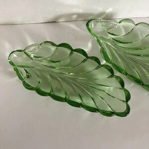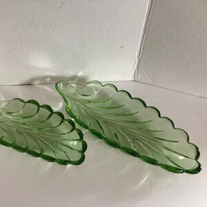 Two leaf shaped dishes from the 1930’s or so. Gorgeous sleek lines and very good quality, heavy pressed glass. Does not glow under UV light unfortunately. Possibly made by Bagley.