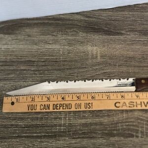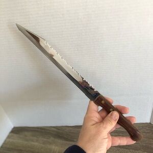 Elegant wooden handled bread knife with a lovely smooth handle. Stainless steel, made in England. Made by Prestige. Double sided knife, overall length is 13 1/2”.