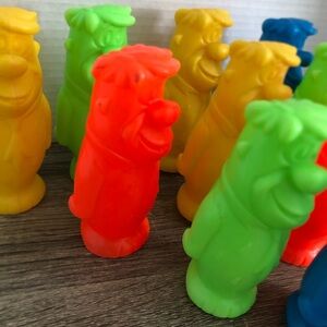 Super cool blow mold Fred Flintstone bowling set. Ten pin set with ball. Marked Hanna Barbera. Very hard to find set!