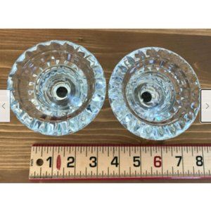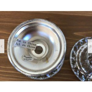 Set of 2 Avon "Classic Elegance" clear glass candle holders with silver plated bases. Silverplate could be polished to restore shine. Candle holders are 3 1/2" across x 3" tall. Good condition, includes original box.