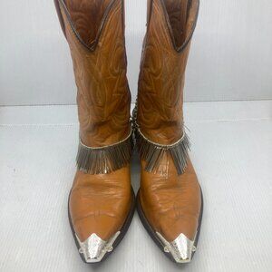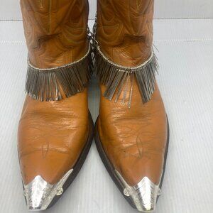 In good worn vintage condition.....See pictures for condition....Two modified fringe metal harness are lightly differents ( and are less vintage).....Made in USA by Acme boots.....Marked 9 C , US womens ....But check your feet measurement to be sure that's your size.....Total height is 11 1/2", and heels are 1.5" height...Outsole measure 11 1/4" x 3 7/8"......