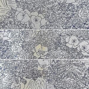 • China tea set-like blue delicate tropical scene motif floral pattern on pale silver grey