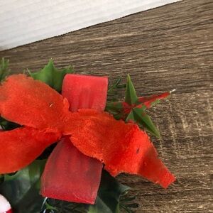 Festive faux greenery tree decor with red bow and silk spun ornaments and blow mold candy canes. Perfect for holiday cheer.